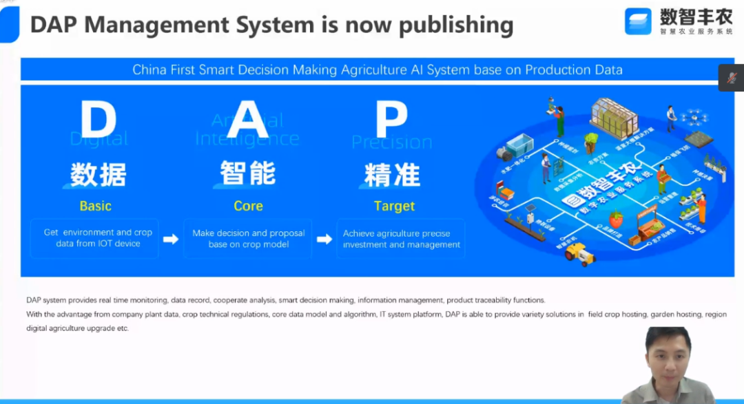 在农业大数据与宏观农业经济专题环节,,,,,,李宇炫以“DAP数智化在农业莳植中的应用探讨”为切入点举行讲话,,,,,,重点先容数智97国际智慧农服系统(简称数智97国际)基础情形以及在现实农业生产中的应用。。。。。。。 。