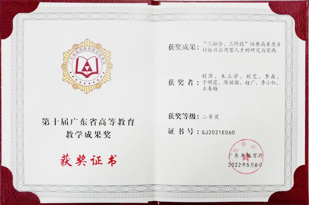 广东省教育教学效果奖每4年评审一次,,,, ,,,获二等奖的效果应当经由不少于2年的实践磨练,,,, ,,,在省内具有先进水平并施展主要树模作用。。 。。。。。。在本次广东省教育教学效果奖中,,,, ,,,《“三融合、三阶段”作育高素质墟落振兴应用型人才的研究与实践》是唯一关注高素质农民教育培训的课题。。 。。。。。。广东省教育厅相关认真人体现,,,, ,,,希望获奖单位和小我私家珍惜声誉、再接再厉,,,, ,,,继续完善和立异获奖效果,,,, ,,,增强获奖效果的推广、交流和应用,,,, ,,,在教育教学刷新、研究和实践中再创佳绩。。 。。。。。。