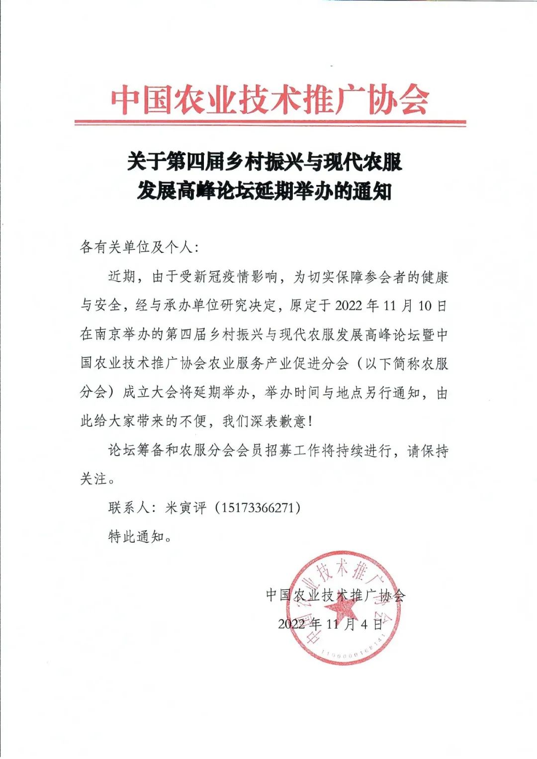 近期,,,,,,,由于受新冠疫情影响,,,,,,,为切实包管参会者的康健与清静,,,,,,,经与承办单位研究决议,,,,,,,原定于2022年11月10日在南京举行的第四届墟落振兴与现代农服生长岑岭论坛暨中国农业手艺推广协会农业效劳工业增进分会(以下简称农服分会)建设大会将延期举行,,,,,,,举行时间与所在另行通知,,,,,,,由此给各人带来的未便,,,,,,,我们深表歉意!