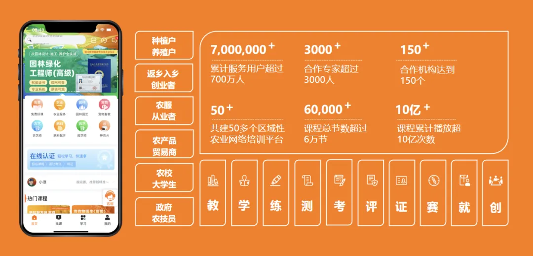 作为海内农业职业教育在线培训平台,,,,,天天学农承继培育新型职业农民的目的,,,,,聚焦墟落振兴推进事情,,,,,形成具有人才培训特色、标准化、全方位的数智化效劳模式。。。。。阻止现在累计效劳用户凌驾700万人,,,,,与3000余名专家相助,,,,,拥有凌驾6万节农业课程,,,,,形成“教、学、练、测、考、评、证、赛、就、创”十大教育机制,,,,,在鼎力大举普及农业职业教育,,,,,提升农业生产手艺,,,,,精准培训新型职业农民等诸多方面高度契合墟落振兴战略和人才振兴政策要求,,,,,在农业新职业人才的作育上颇具效果。。。。。